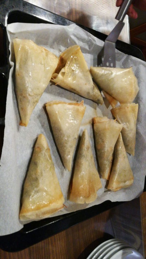 Agafes la pasta filo (en plaques), les pintes amb oli i afegeixes una mica de la massa del bol formant triangles.