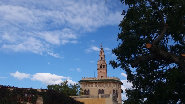 En el jardí hi ha una carpa, com si estiguessis en un teatre. Ens van començar a parlar de Joan Roquer i Candelària Negravernis  matrimoni que va anar de viatge de noces a Andalusia i s’en van enamorar, tornant es van fer construir una replica de la Giralda, a, com a casa d’estiueig.
