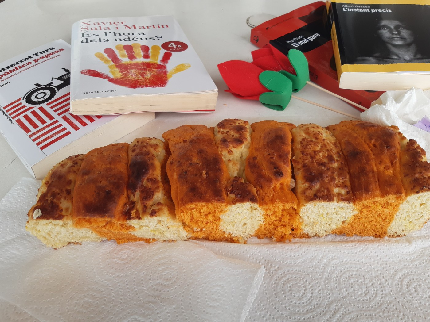 A la nit vaig fer el pa de Sant Jordi, amb les quatre barres catalanes, per fer: els colors colorant i sobrassada.