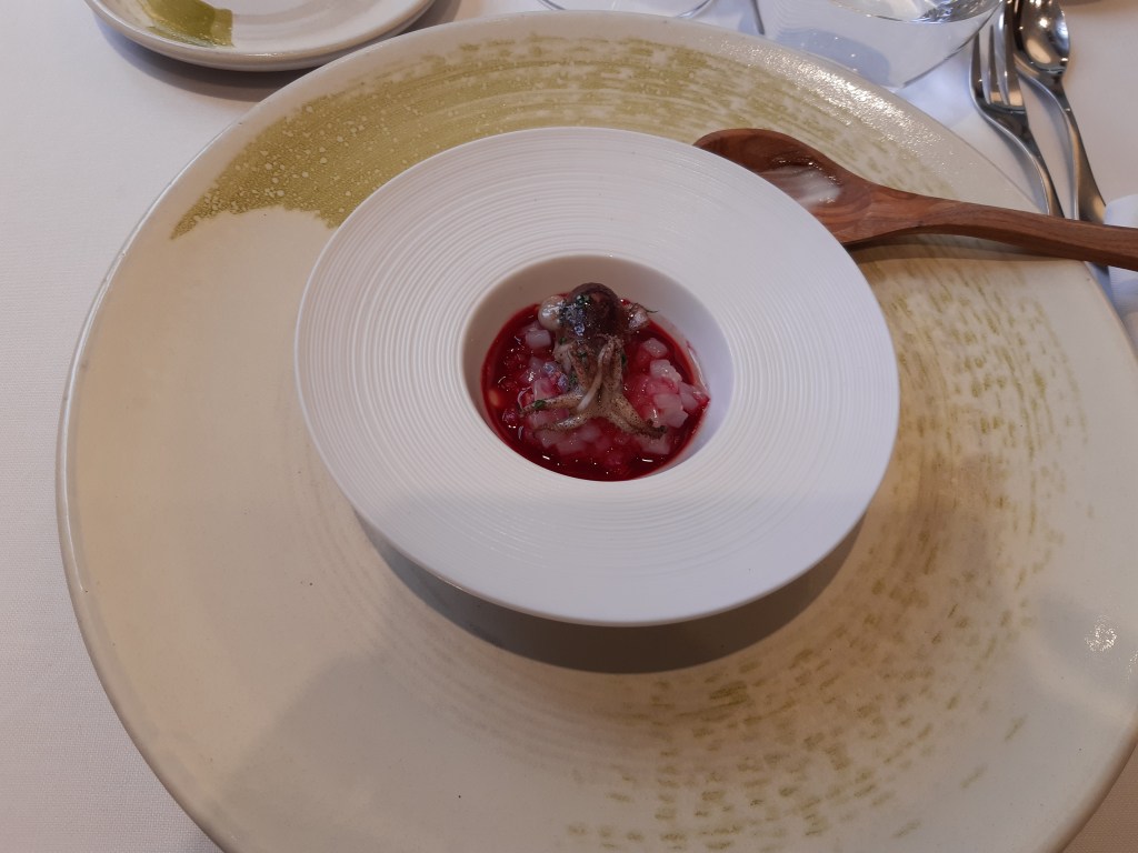 El aperitiu de la casa es tractava de un petit pastis de escorpora, croqueta de gamba i consomé de esparraques acompanyat de una copa de cava desprès una amanida de alvocat, llagostins i salmó marinat; Arròs cremós amb ceps i gambes. Turnedó de vedella amb foie i salsa de Oporto.
