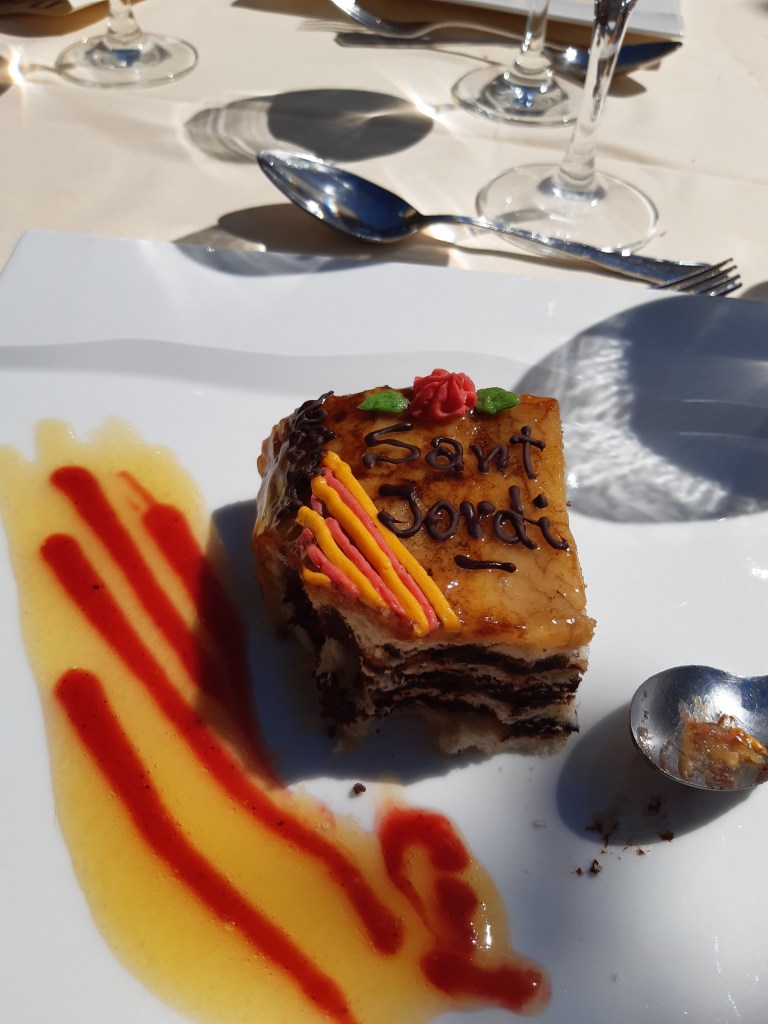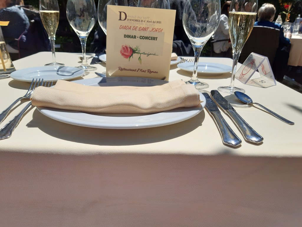 A fet un dia esplèndid de sol i com tenien una reserva en el restaurant Mas Romeu, hem gaudit de la festivitat a la terrassa, desfruitant el menú degustació del xef Jordi: