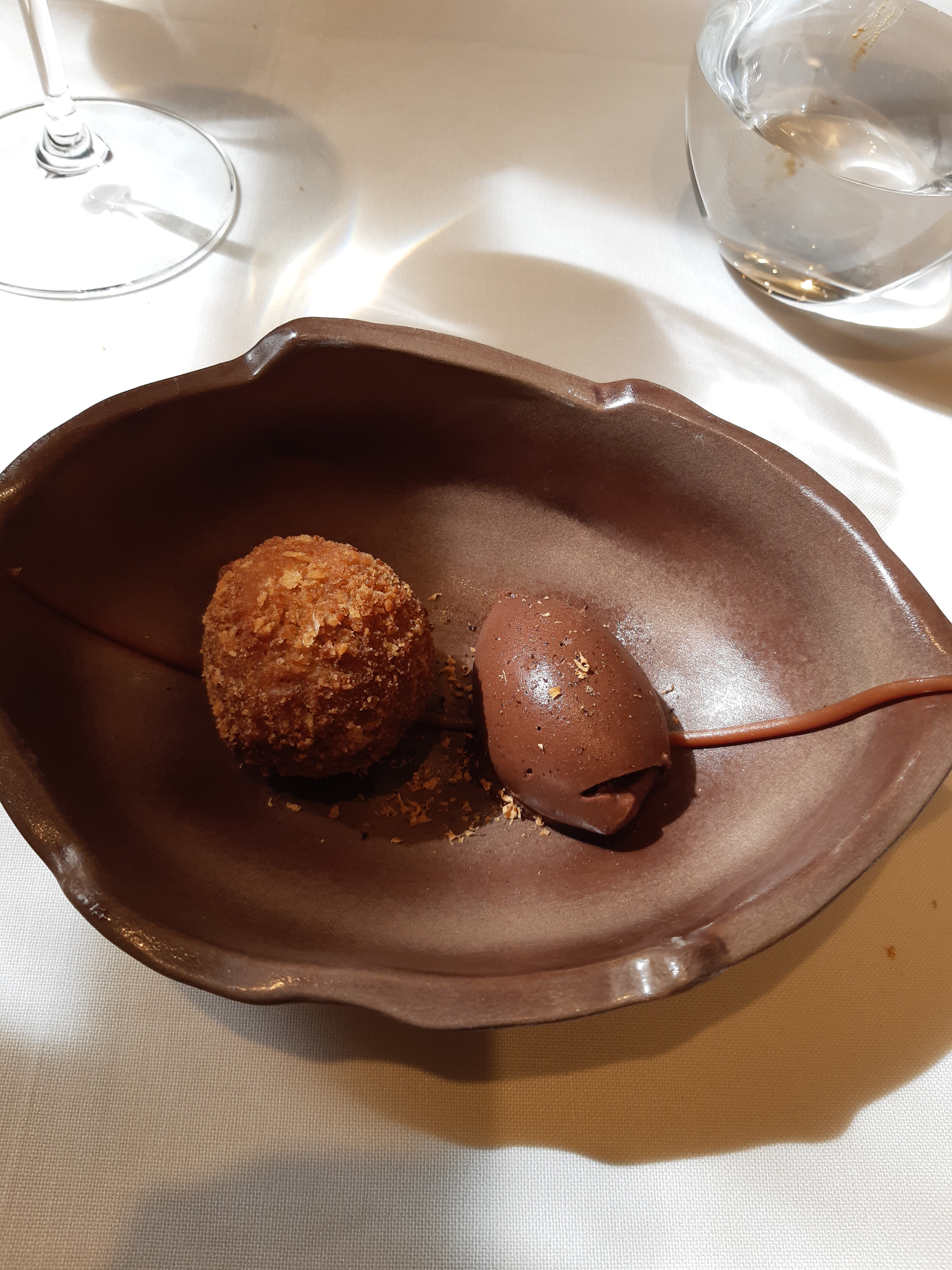 El aperitiu de la casa es tractava de un petit pastis de escorpora, croqueta de gamba i consomé de esparraques acompanyat de una copa de cava desprès una amanida de alvocat, llagostins i salmó marinat; Arròs cremós amb ceps i gambes. Turnedó de vedella amb foie i salsa de Oporto.