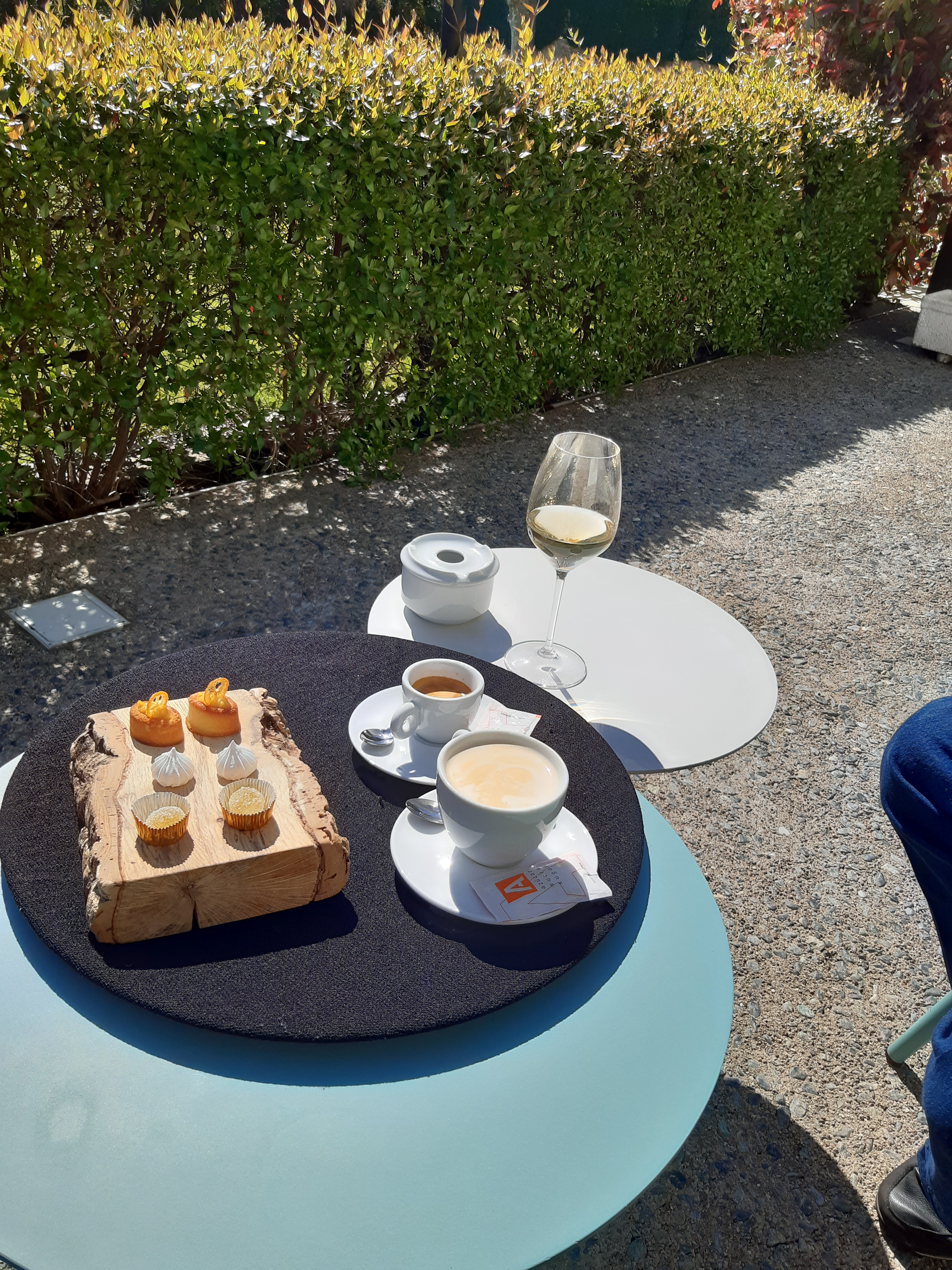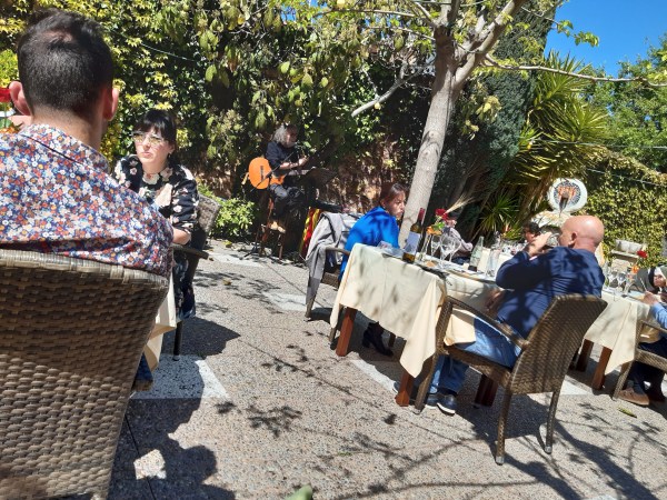 A fet un dia esplèndid de sol i com tenien una reserva en el restaurant Mas Romeu, hem gaudit de la festivitat a la terrassa, desfruitant el menú degustació del xef Jordi: