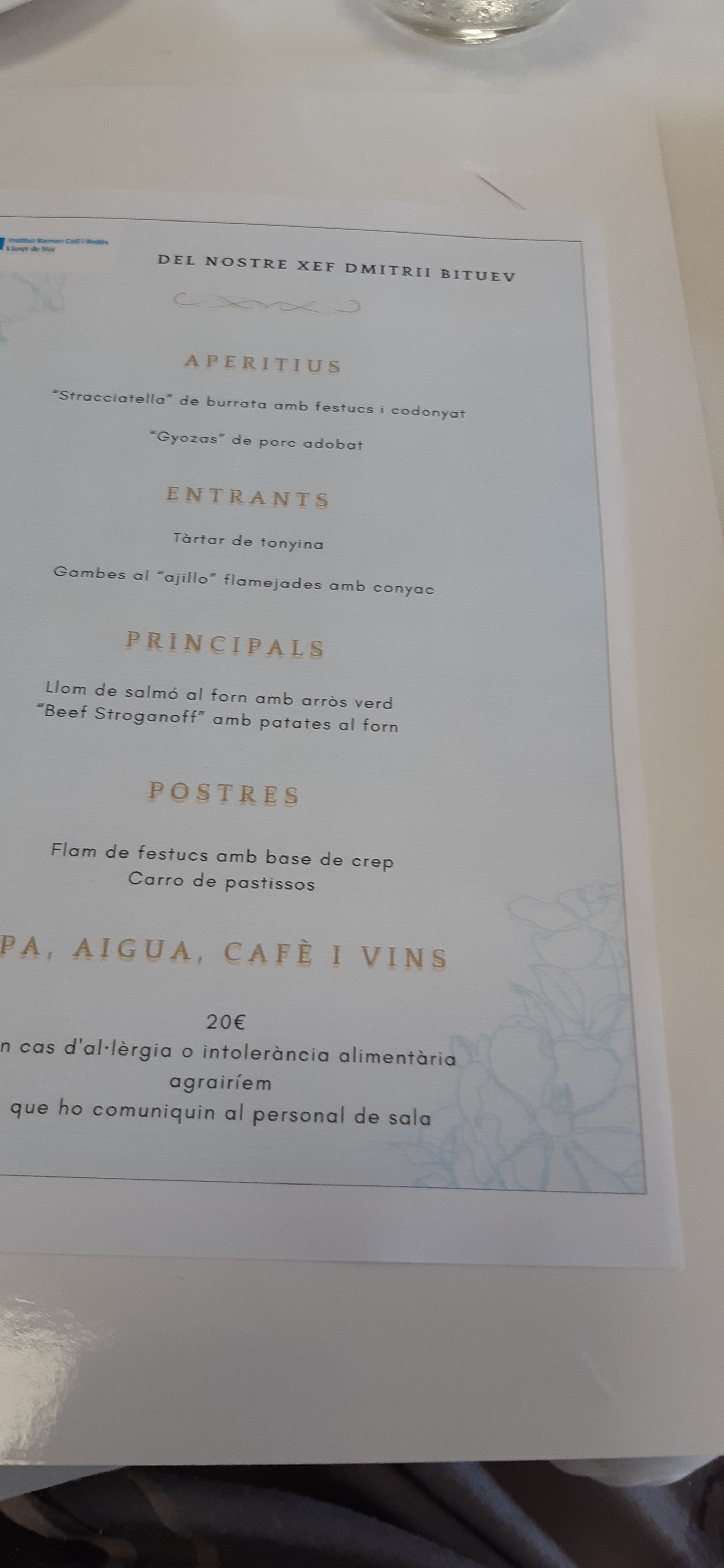 El IES restaurador de Lloret, la setmana passada, ja estaven preparant el projectes de fi de curs, aquesta setmana voliem menjar el menú de les Jornades de l’arròs que acaben el 28, i res ja no el feien tots estaven comptant que faltaven 2 dies pel final de curs, mes van menjar molt bé, ben atesos, i un arròs cremós verd espectacular. El professor al cobrar i acomiadar-se fins el curs que bé, i començar en nous alumnes.