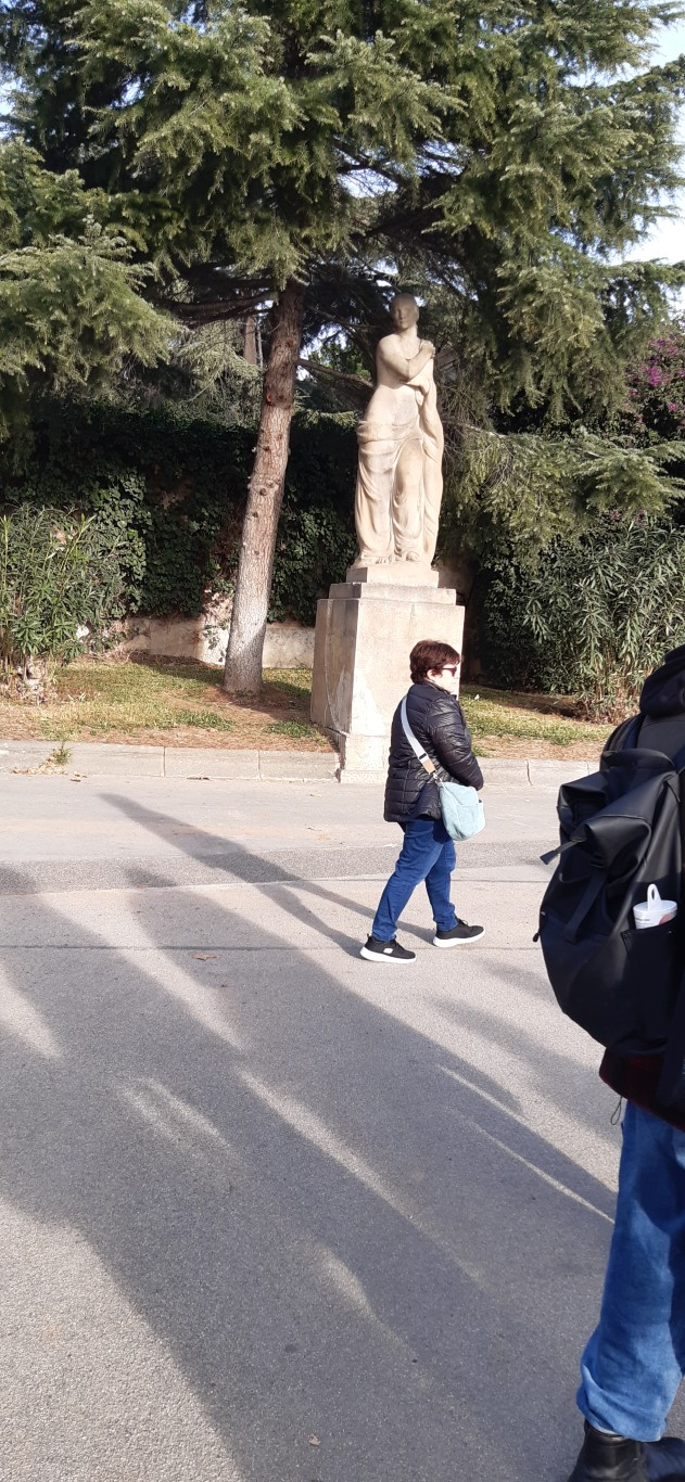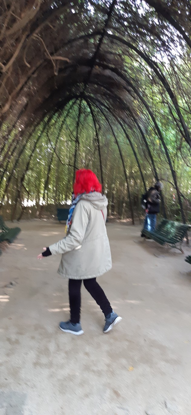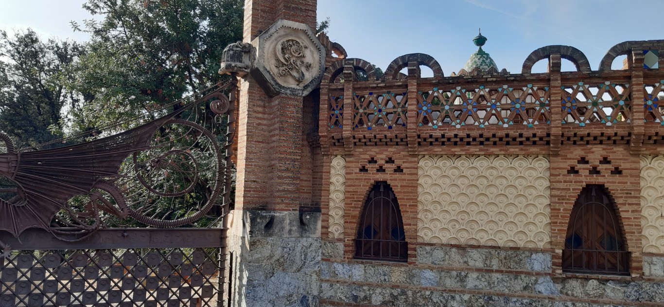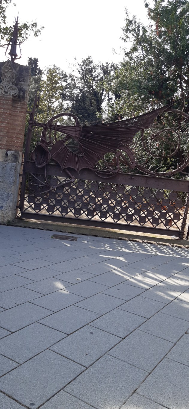 El va començar Elisenda de Montcada, en les Corts per ser lliure d’imposts, després va fer el cementeri església més tard el va comprar Joan Güell en 5 masos entre ells Can Cuyas. Hi havien dues fonts de Gaudí, mes Franco va destruir molta cosa de signe català, la que us mostro es va salvar per què va quedar tapada per la malesa, la pèrgola també la va fer Gaudí per gaudir de fresca l’estiu, això és una estàtua reivindicativa pels jocs infantils, ¿com en un jardí tan gran no hi havia espai pels infants?