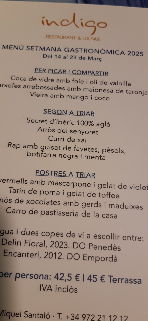 També Girona va promocionar “La setmana Gastronòmica”, pels seus restaurants, jo vaig escollir, Indigo, que està en un hotel, pensàvem que l’havien canviat, perquè abans estava el Pati Verd, i tenien raó, perquè estàvem els dos, igual és un d’estiu, mes ara no funcionava, l’oferta del menú de promoció era bona, amb qualitat i servei.
