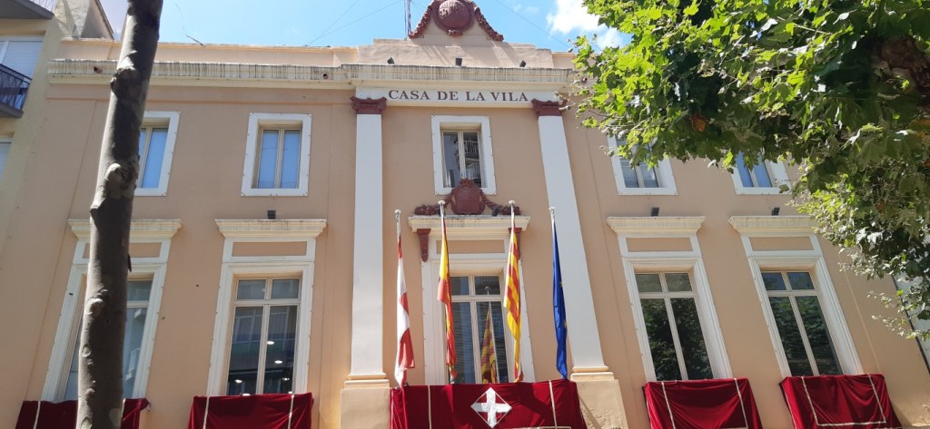 L’ajuntament engalanat per les festes, i els gegants Caterina i Gasto van ballar baixant pel carrer Ample, i entrem al passeig de Mig, a ritme de pasdoble.