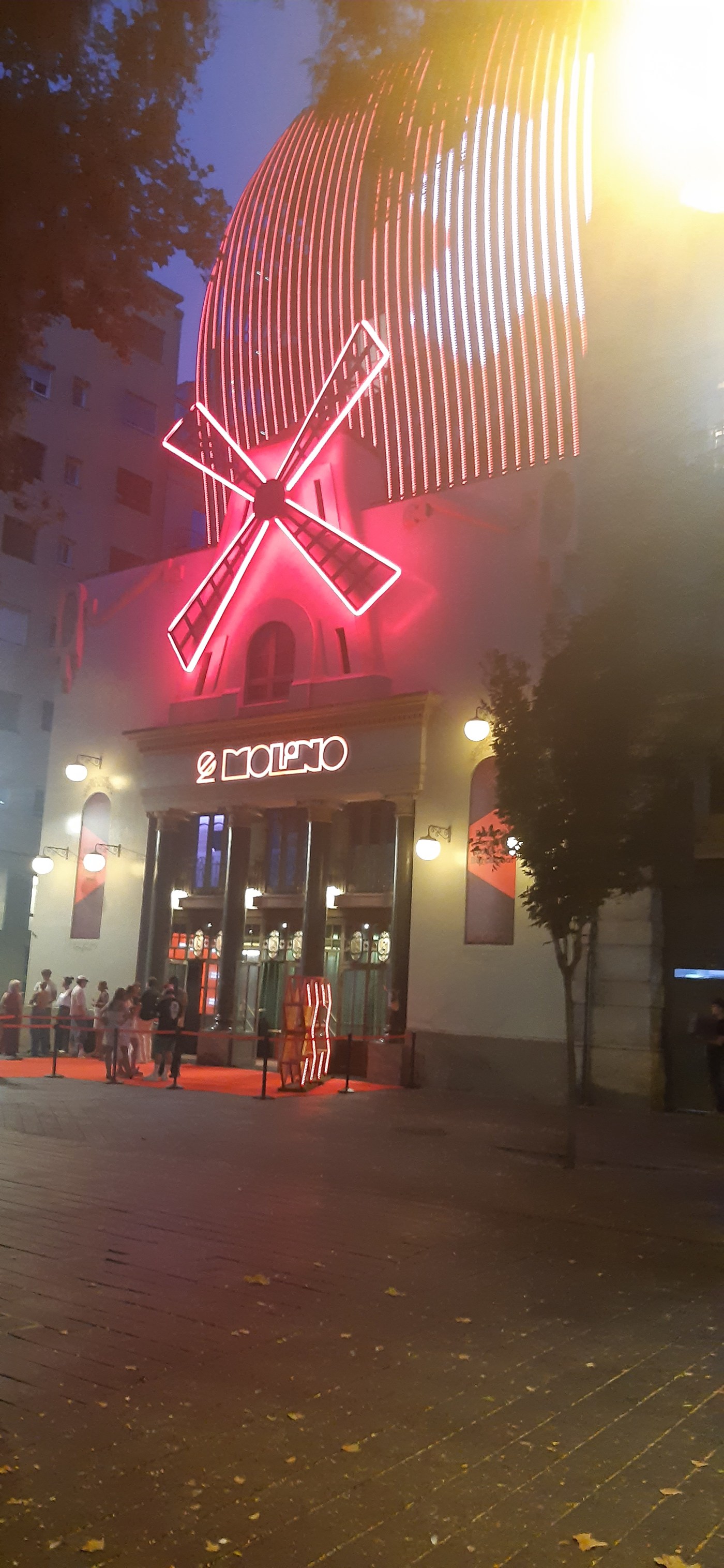Sortim i el carrer sembla que cremi, El Molino amb les aspes roden vermella, la gent els bars turistades, i gent de totes parts del món. Van fer un mini àpat, i el preu bé res de turístic.